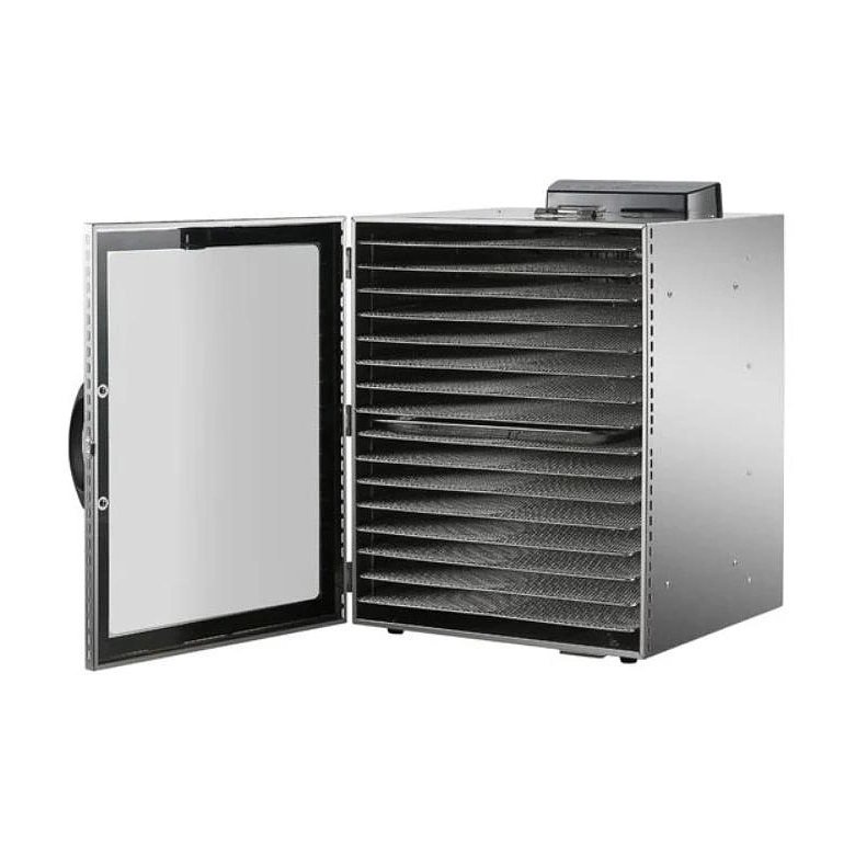 Корпус и решетки выполнены из нержавеющей стали, устойчивой к нагреву и легко очищаемой от остатков пищи. Вентиляционные отверстия обеспечивают равномерную циркуляцию горячего воздуха по всей камере, а прогрев перед загрузкой занимает всего 5-10 минут. Дегидратор EKSI HFD-16 отлично подойдет для кафе, производств с фермерскими заготовками, эко-магазинов и цехов по выпуску снеков.