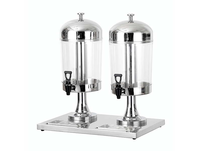 Двойной диспенсер объемом 8 литров каждый, выполненный из прочной стали и пластика, позволяет одновременно хранить и подавать два разных напитка.