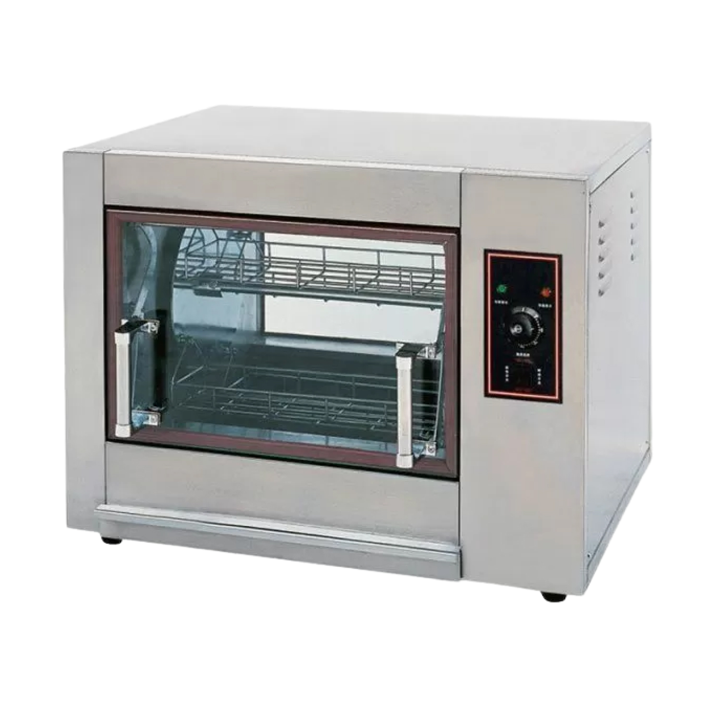 Электрический настольный гриль EKSI HEJ-266 — это промышленное устройство, которое предназначается для жарки цельной курицы и другой домашней птицы в торговых точках и в заведениях общественного питания. Особенностью модели является то, что она оснащена удобной панелью управления, таймером, а также термостатом и терморегулятором. Кроме того, в гриле установлены мощные ТЭНы, съемные карусельные вертела и корзины. Жир, образующийся во время жарки, стекает в специальный поддон. Гриль изготовлен из нержавеющей прочной стали, а его дверцы и задняя панель — из жаропрочного стекла. Он может быть установлен на столе и требует подключения к электричеству. Куры в таком устройстве получаются сочными и полностью прожаренными.