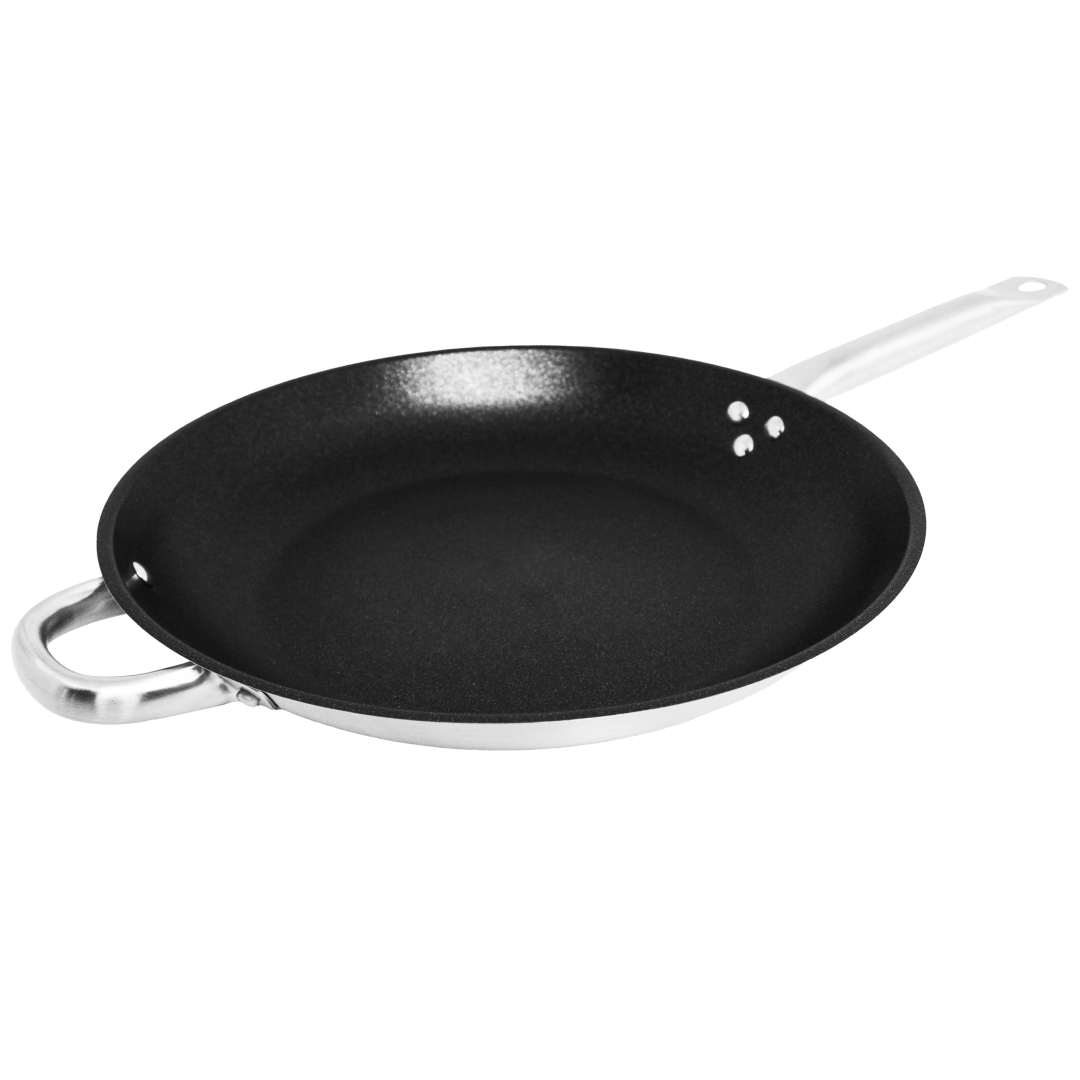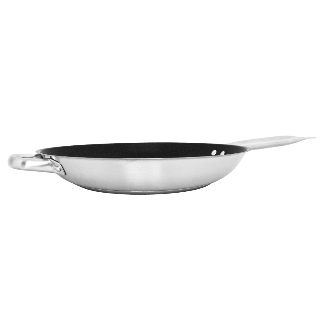 Сковорода 34 см из прочной нержавеющей стали AISI 201 с трехслойным дном подходит для любой плиты, будь то газовая, галогеновая, индукционная или керамическая. Модель идет без крышки.