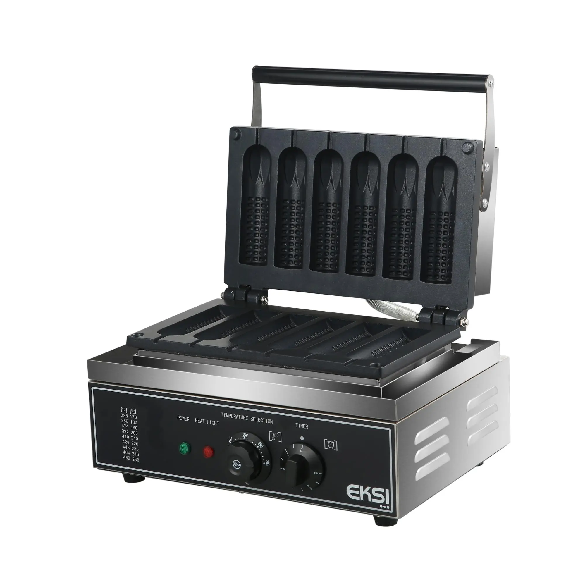 Аппарат для производства корн-догов т.м. EKSI , серии ECD, мод. ECD-6, 335х300х245 мм, 1600 Вт, 220 В, на 6 корн-догов, размер корн-догов 140х40х15 мм, материал корпуса - нержавеющая сталь, материал рабочей поверхности - алюминий